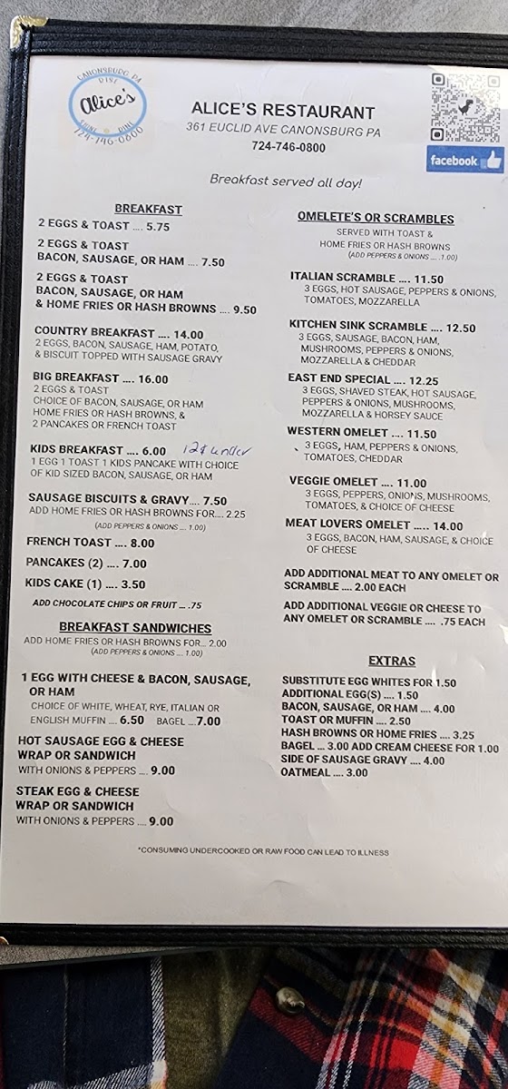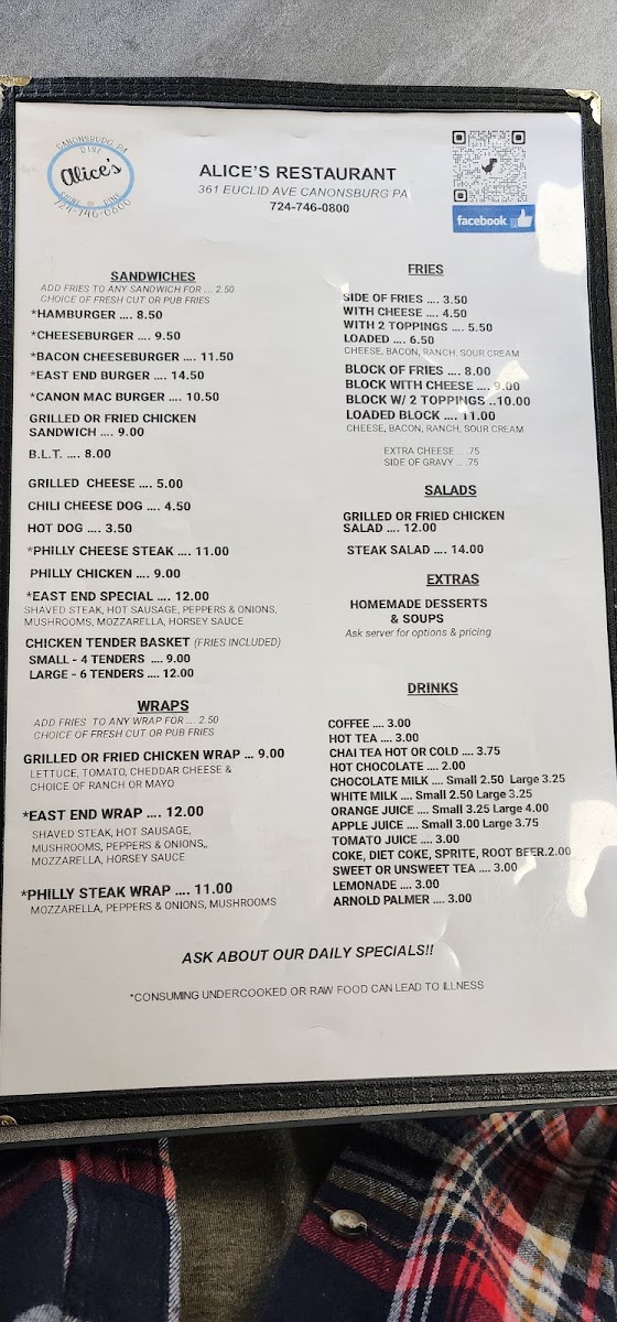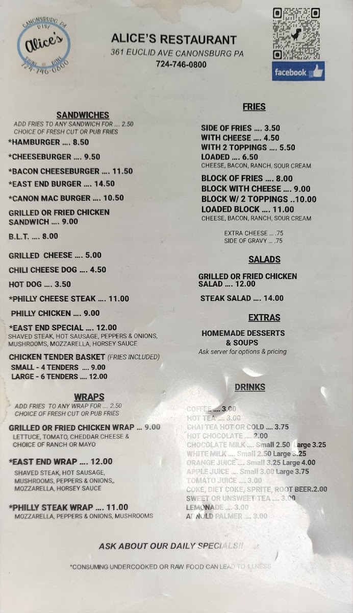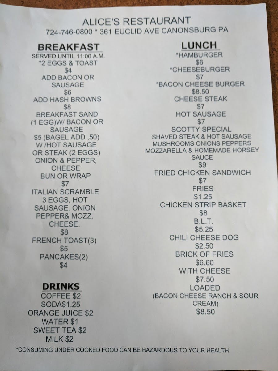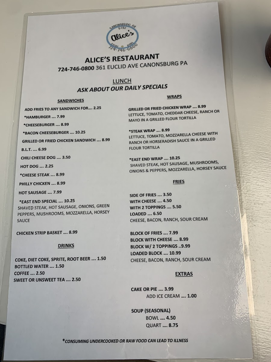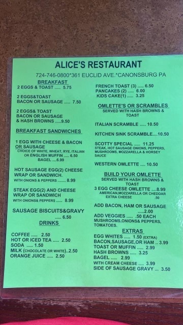 Alice's Restaurant - Canonsburg Menu